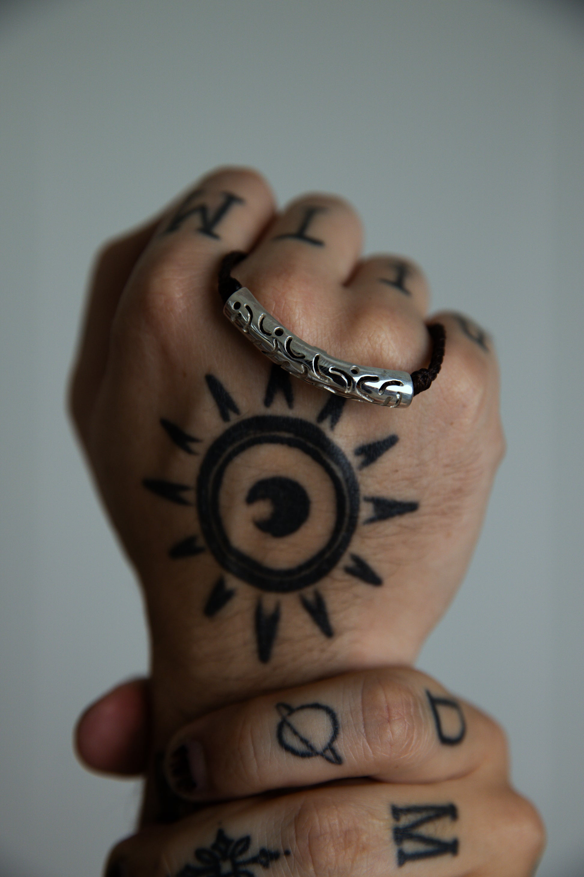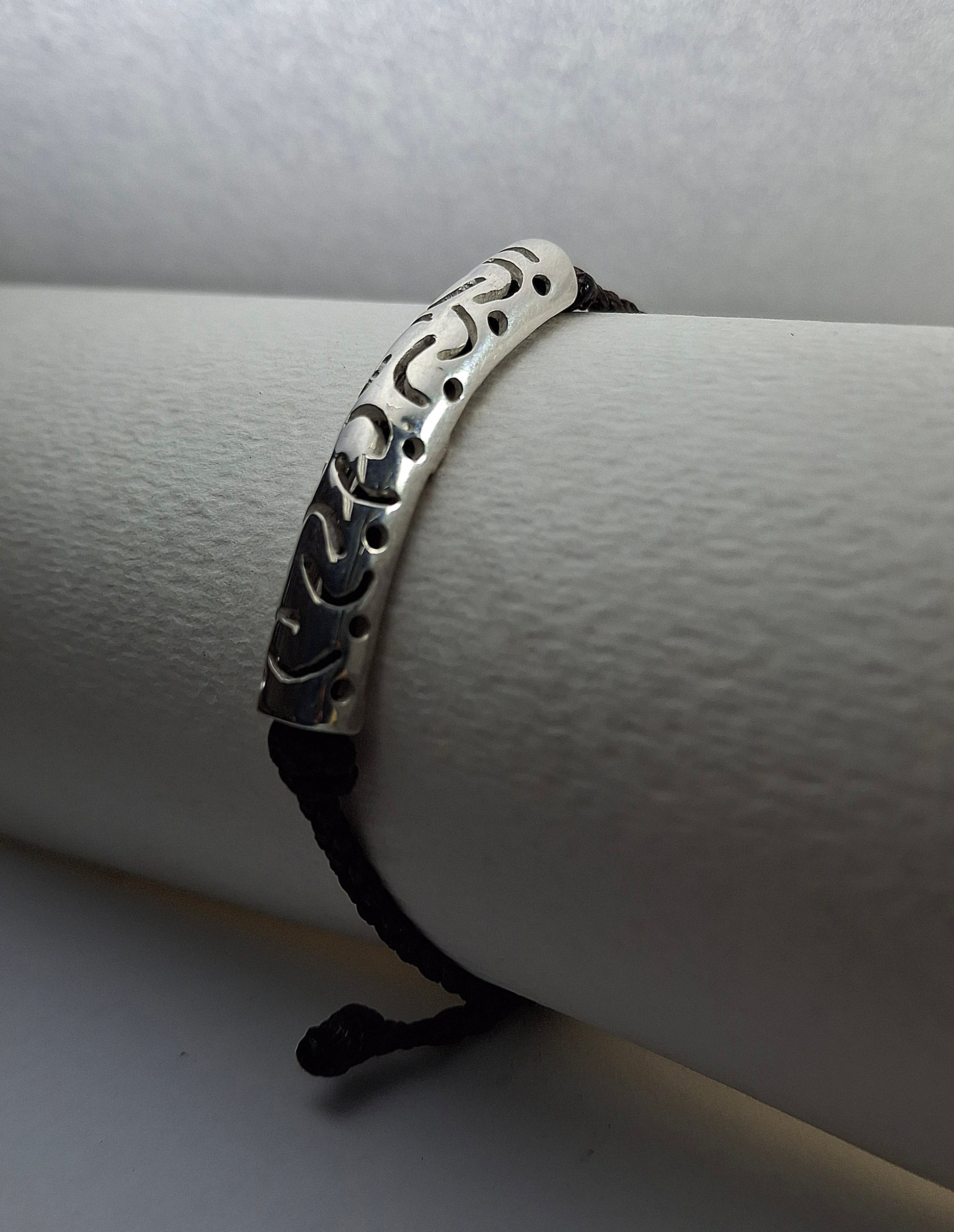 Leather & 925 Sterling Silver bracelet with hand-craved details and adjustable leather strap.