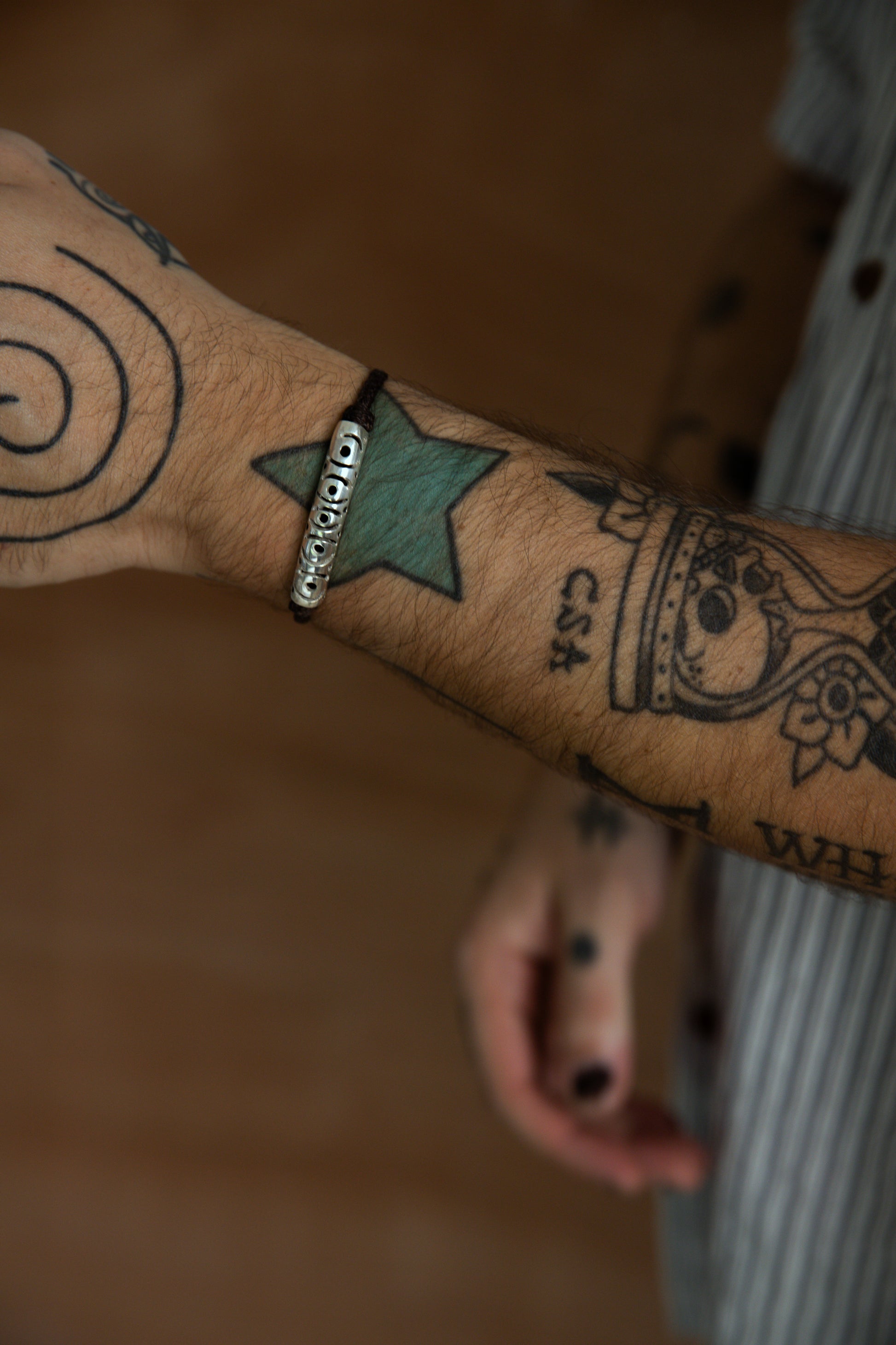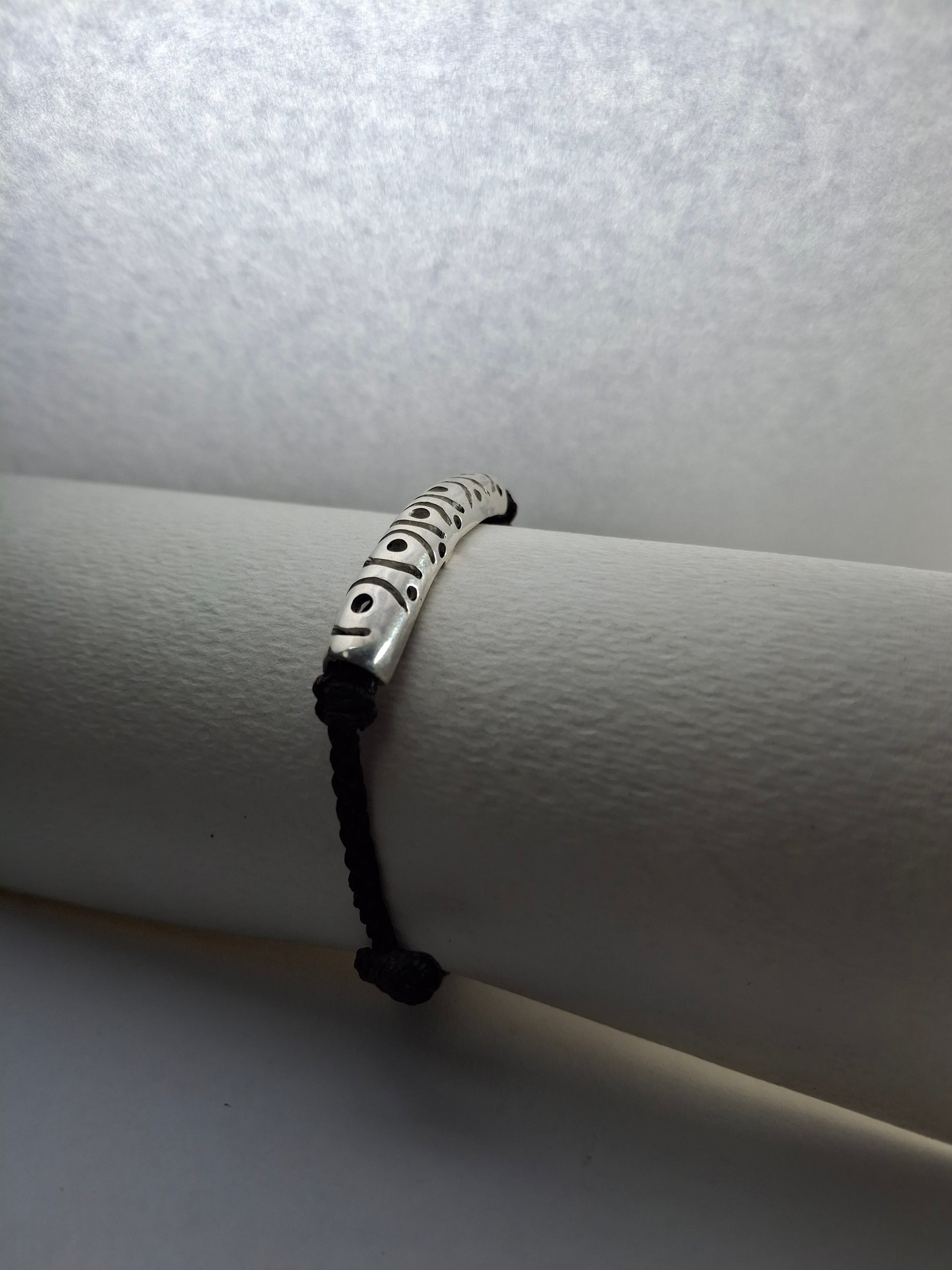 Leather & 925 Sterling Silver bracelet with hand-craved details and adjustable leather strap.