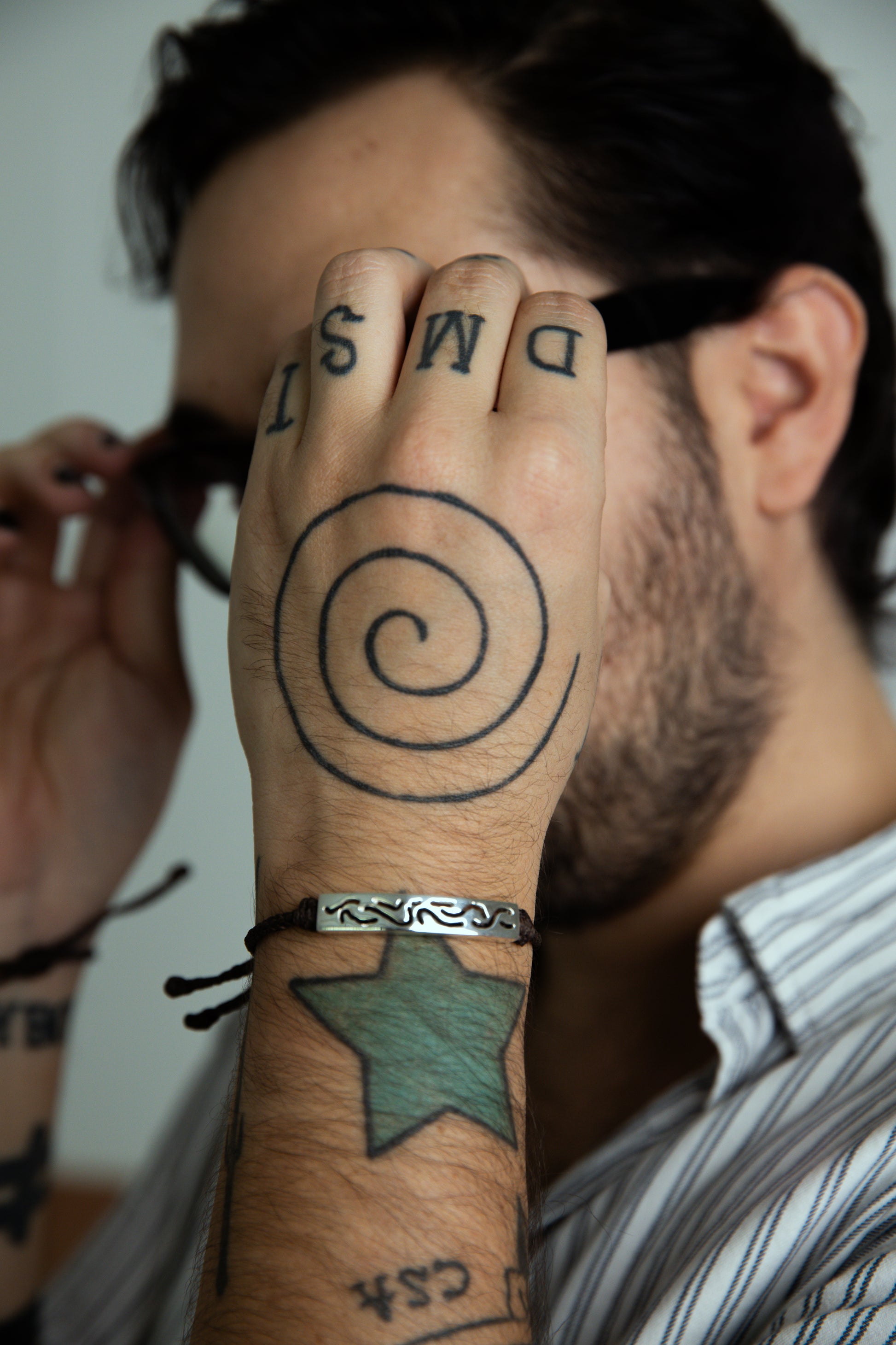 Leather & 925 Sterling Silver bracelet with hand-craved details and adjustable leather strap.
